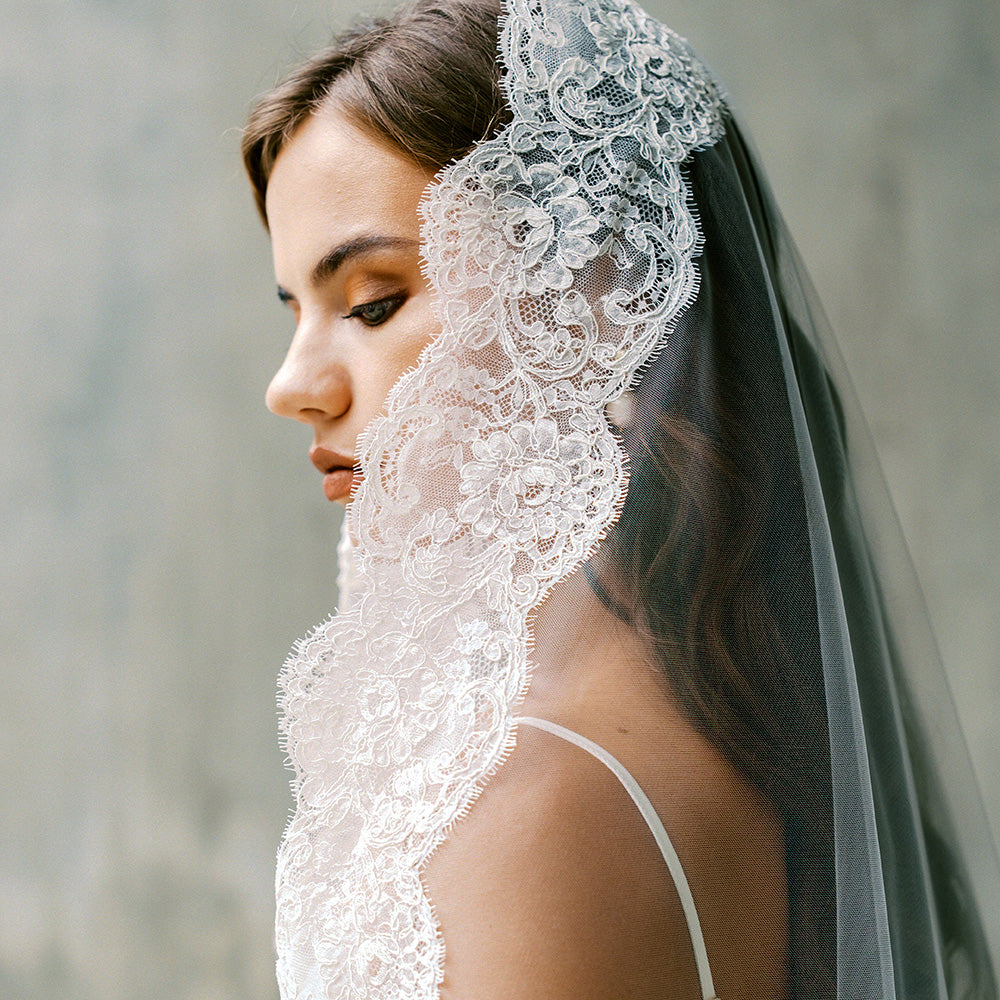 For the veil length, we offer fingertip, shoulder length, or full-length pieces like a chapel or cathedral veil which can be attached to the bride's hair accessories such as a tiara, comb, or even headbands. It's also common to see pearls, crystals, and other decorations like sequin on wedding veils with lace detailing.