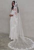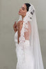 This is a white wedding veil that incorporates lace decorations. Since lace is a delicate fabric like tulle and silk, lace bridal veils provide a touch of elegance to a bride's attire. Renowned for its timeless appeal and style, the addition of lace edge veils enhance the bride's overall appearance, infusing it with an air of romantic charm.