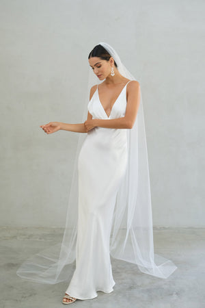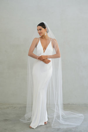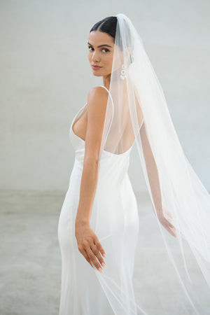 Alexa I is a beautifully simple single-tier veil available in multiple lengths. Sheer tulle is the most widely used bridal tulle, as it creates a gorgeous voluminous shape. In contrast to other veils, Alexa's sheer tulle is gathered at the comb. Thistechnique cleverly creates volume and allows the veil to fall in evenly space folds, which gives the bride a more classic look, while still remaining fairly minimal.