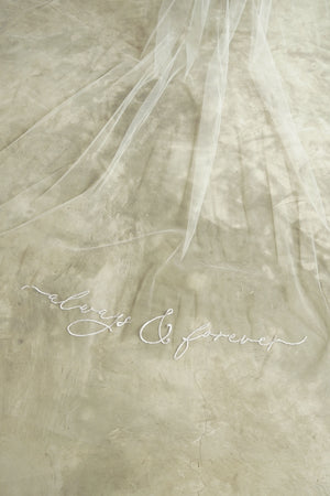 Our embroidered veils are the perfect choice to encapsulate your special day in a few unique words romantically. Expert artisans embroidered our thoughtful phrases in Madame Tulle's exclusively designed font. The embroidery is remarkably soft and does not disturb the naturally soft drape of the tulle but instead lies beautifully flat and easy to read.