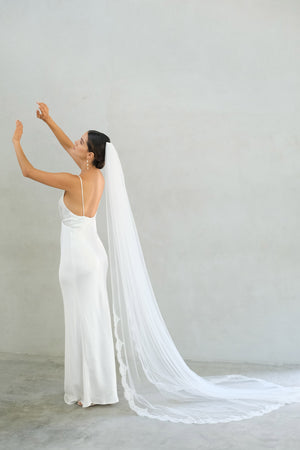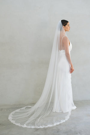 BELLEROSE III This one-tier veil features a delicate partial lace trim, adding a classic touch to your special day.
