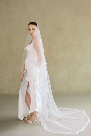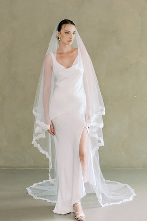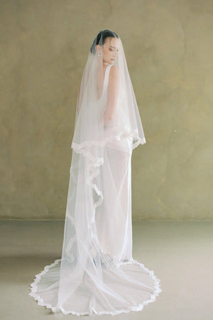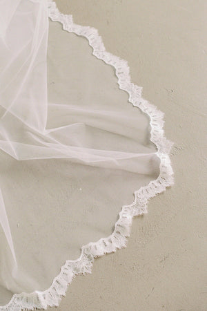 Drop veil (no gathers on comb) with Chantilly lace trim. The top tier (blusher) can be worn over the face.