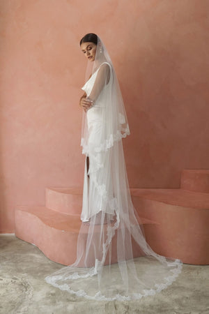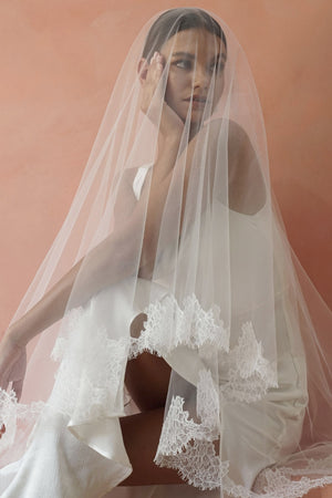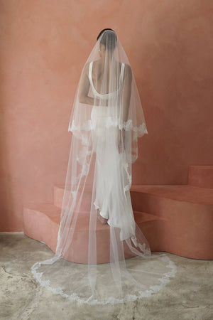 Complete your classic yet modern bridal look with the CELINE II drop veil. This two-tier veil features a delicate Chantilly lace trim which adds a beautifully romantic touch. Perfect for any bride searching for a soft, elegant look with timeless finish.