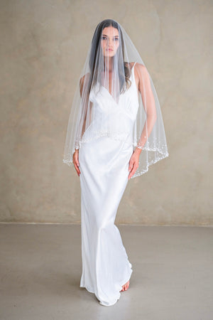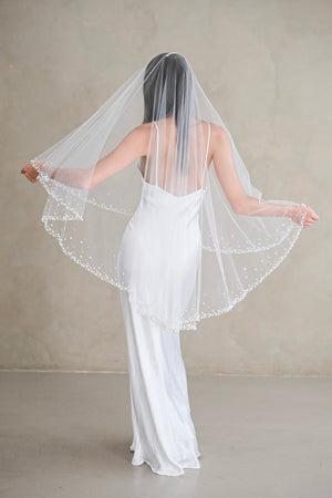 Drop veil (no gathers on comb) with small to medium sized faux pearls, and sequins.