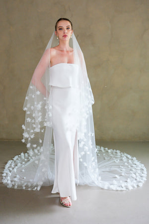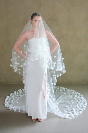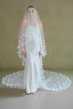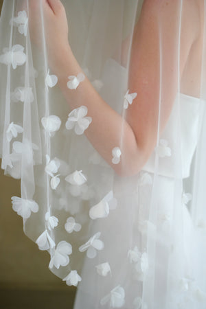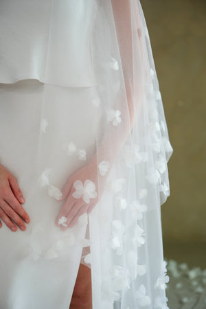 Introducing FLORA II the perfect accessory for a romantic wedding. This drop veil features delicate fabric flowers around the edges, adding a touch of elegance to your special day. Elevate your look with this luxurious and exclusive veil.