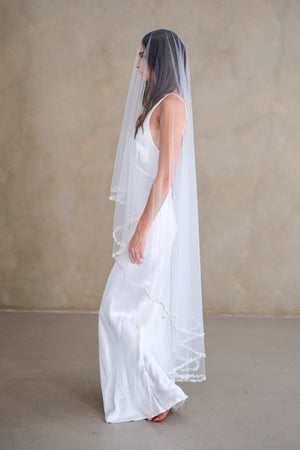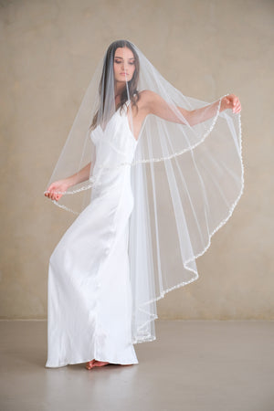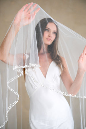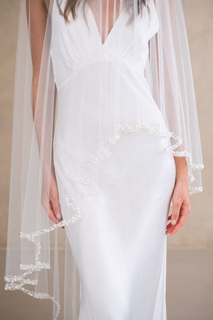 Drop veil (no gathers on comb) with various sized faux pearls.