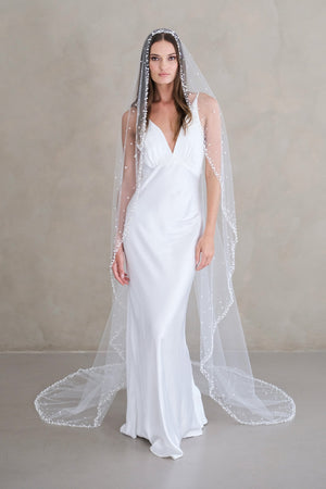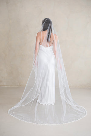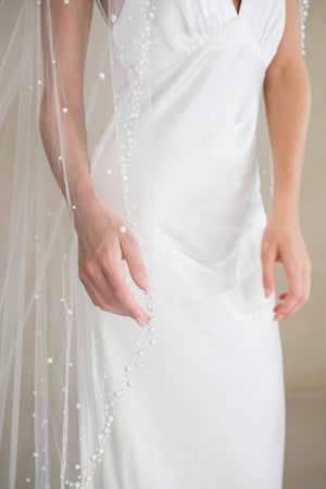 One-tier veil with various sized faux pearls, and sequins (handsewn).