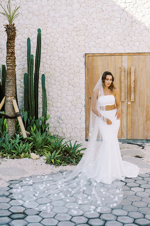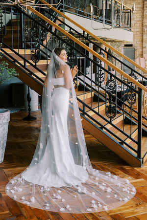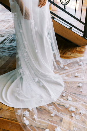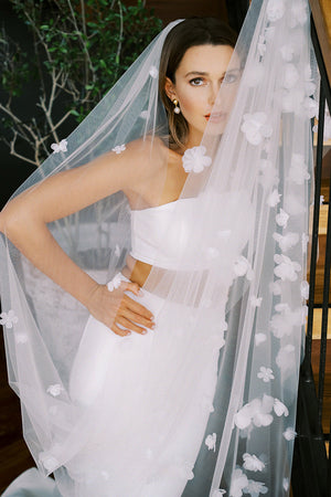 The Nina is a statement veil, it's unique, soft and flowy. It is scattered with small to medium sized fabric flowers, mimicking the beautiful irregularity of patterns and shapes for a unique and spontaneous veil arrangement. Nina is a single-tier veil, perfect for the bride who wants to add a little bit extra to their overall bridal look.