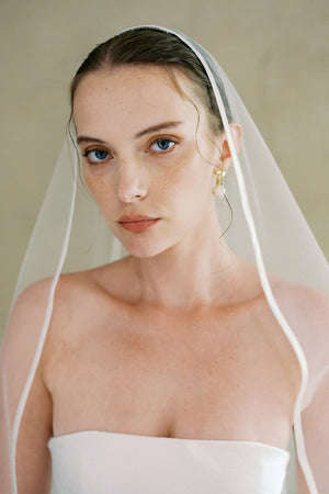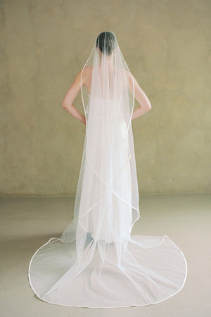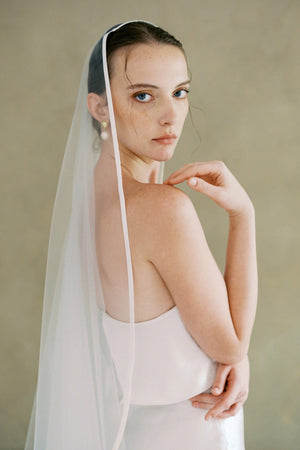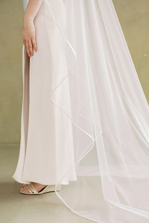 One-tier minimalist style bridal veil with 7mm satin bias binding.