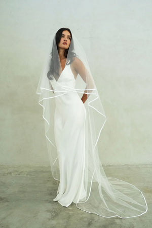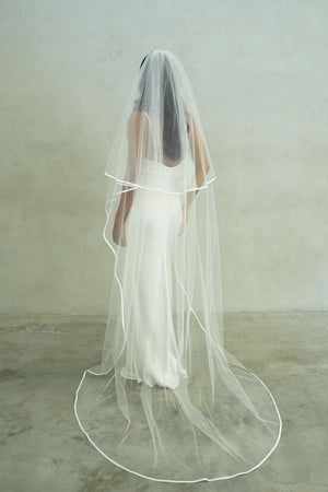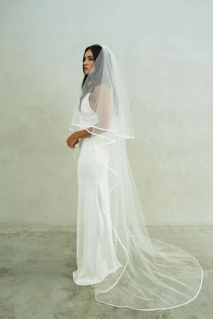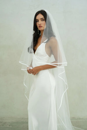 Enhance your bridal look with our SIERRA II two-tier satin edge veil. The classic style adds a modern touch to any wedding ensemble. Made for the contemporary bride, this veil is the perfect finishing touch. Elevate your look and make a statement on your special day.