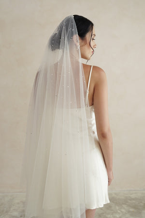 Drop veil style (no gathers on comb) adorned with double-sided Swarovski crystals (in different sizes), the top tier (blusher) can be worn over the face.