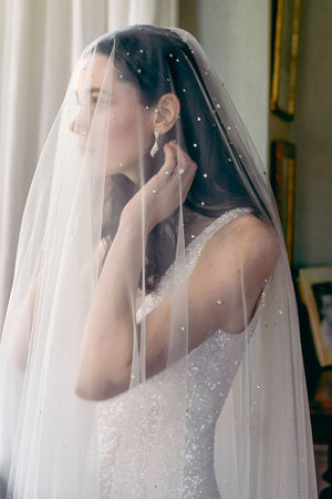 The STELLA II Crystal Drop Veil is the perfect choice for modern and classic brides. Crafted with two-tiers of fine tulle and detailed with sparkling Swarovski crystals that cover both sides of the veil, ensuring an exquisite view from every angle, this veil is sure to make your special day shine.
