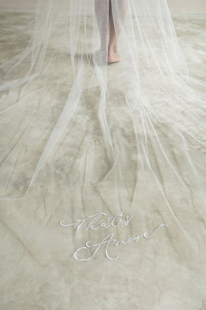 Our embroidered veils are the perfect choice to encapsulate your special day in a few unique words romantically. Expert artisans embroidered our thoughtful phrases in Madame Tulle's exclusively designed font. The embroidery is remarkably soft and does not disturb the naturally soft drape of the tulle but instead lies beautifully flat and easy to read.