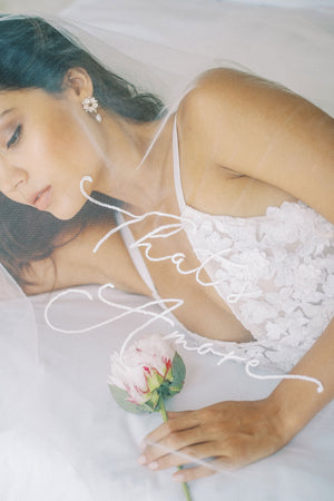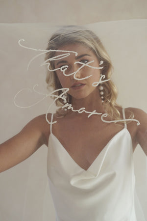 Our embroidered veils are the perfect choice to encapsulate your special day in a few unique words romantically. Expert artisans embroidered our thoughtful phrases in Madame Tulle's exclusively designed font. The embroidery is remarkably soft and does not disturb the naturally soft drape of the tulle but instead lies beautifully flat and easy to read.
