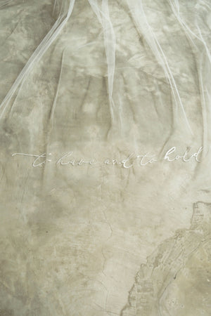 Our embroidered veils are the perfect choice to encapsulate your special day in a few unique words romantically. Expert artisans embroidered our thoughtful phrases in Madame Tulle's exclusively designed font. The embroidery is remarkedly soft and does not disturb the naturally soft drape of the tulle but instead lies beautifully flat and easy to read.