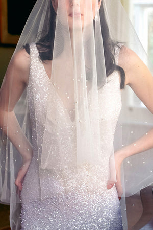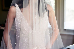 Madame Tulle pearl veils uniquely stand out from others, not only are they entirely hand embellished, but they are also completely free of metal pins. Both sides of the veil are beautifully spread with choice pearls, making it the perfect option for two-tier veils with a blusher. When the blusher is lifted over the head, the pearls will still gracefully be on display from both sides. Our method of double-sided pearls also prevents the underside of the veil from potentially catching on the dress as you walk.