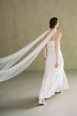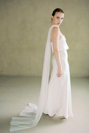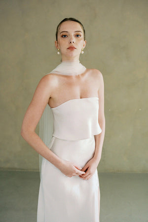 LANA is an elegant and refined bridal scarf, made with premium soft tulle. This posh accessory brings a sense of romance to modern wedding gown and elevates your bridal looks.