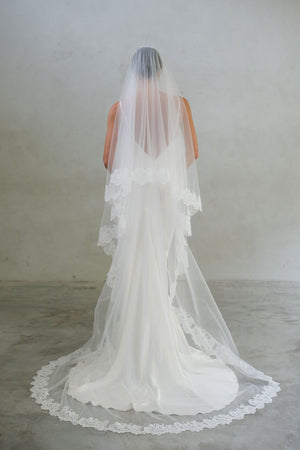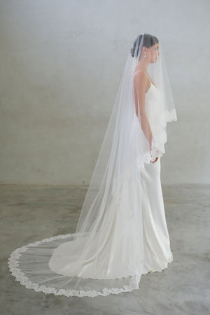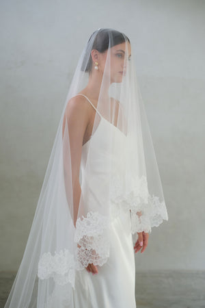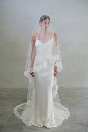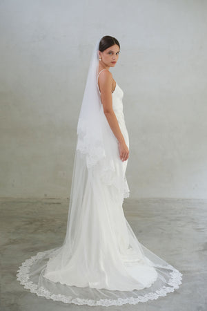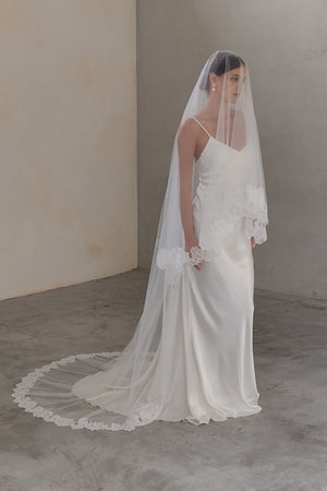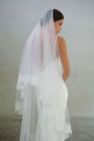CLARISSA II lace-trim two-tier veil features a classic drop style for effortless elegance. Crafted from sheer tulle, it lies flat on the head for a smooth, elongated look. Finished with soft lace edging, the blusher layer offers a timeless option for the ceremony.