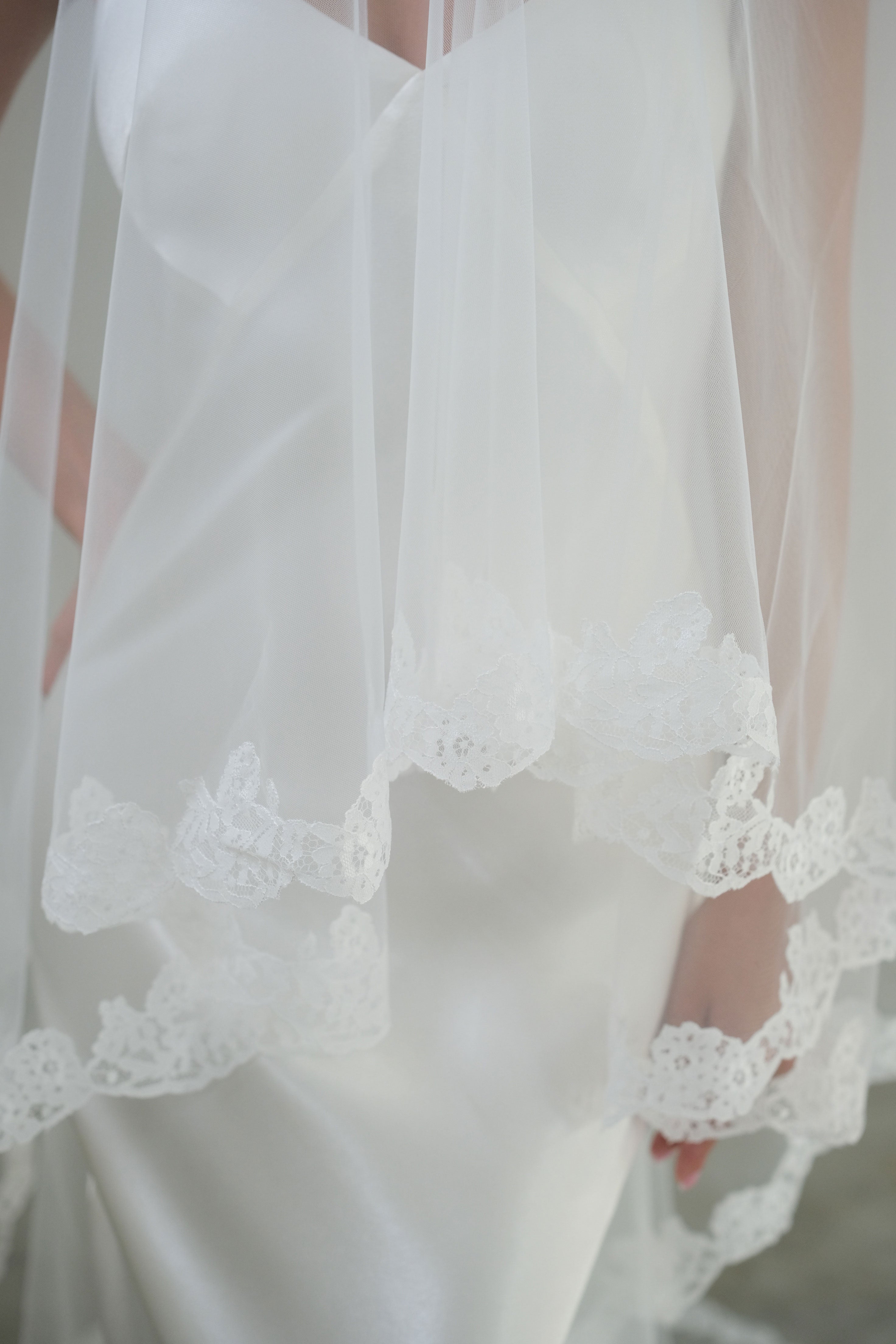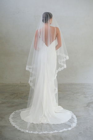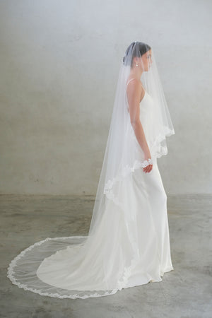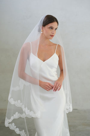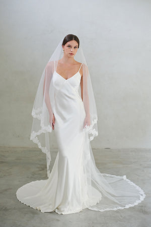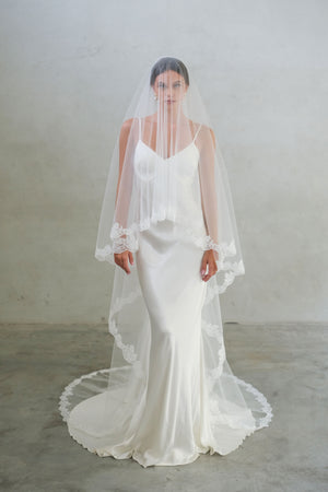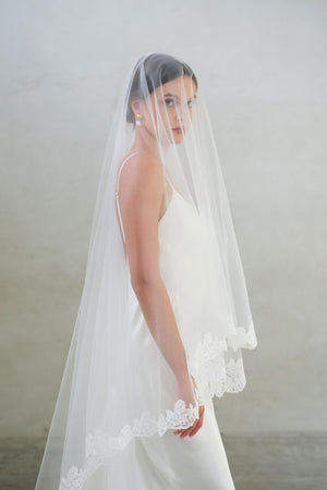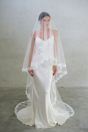 CORA II two-tier lace-edged drop veil offers a clean and graceful silhouette. The sheer tulle falls smoothly from the comb with no gathering, and the blusher layer can be worn over the face for a classic bridal finish.