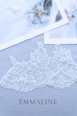 This one-tier veil is softly gathered at the comb for subtle volume and shape (not a mantilla style). It features a partial lace trim that begins at elbow length on either side, framing the lower portion of the veil with delicate detail. The veil is attached to a 3.5” (8.5 cm) wide metal wire comb for secure and comfortable placement.