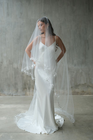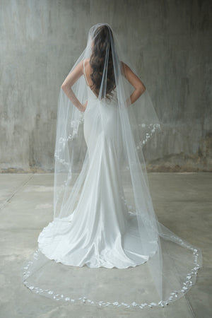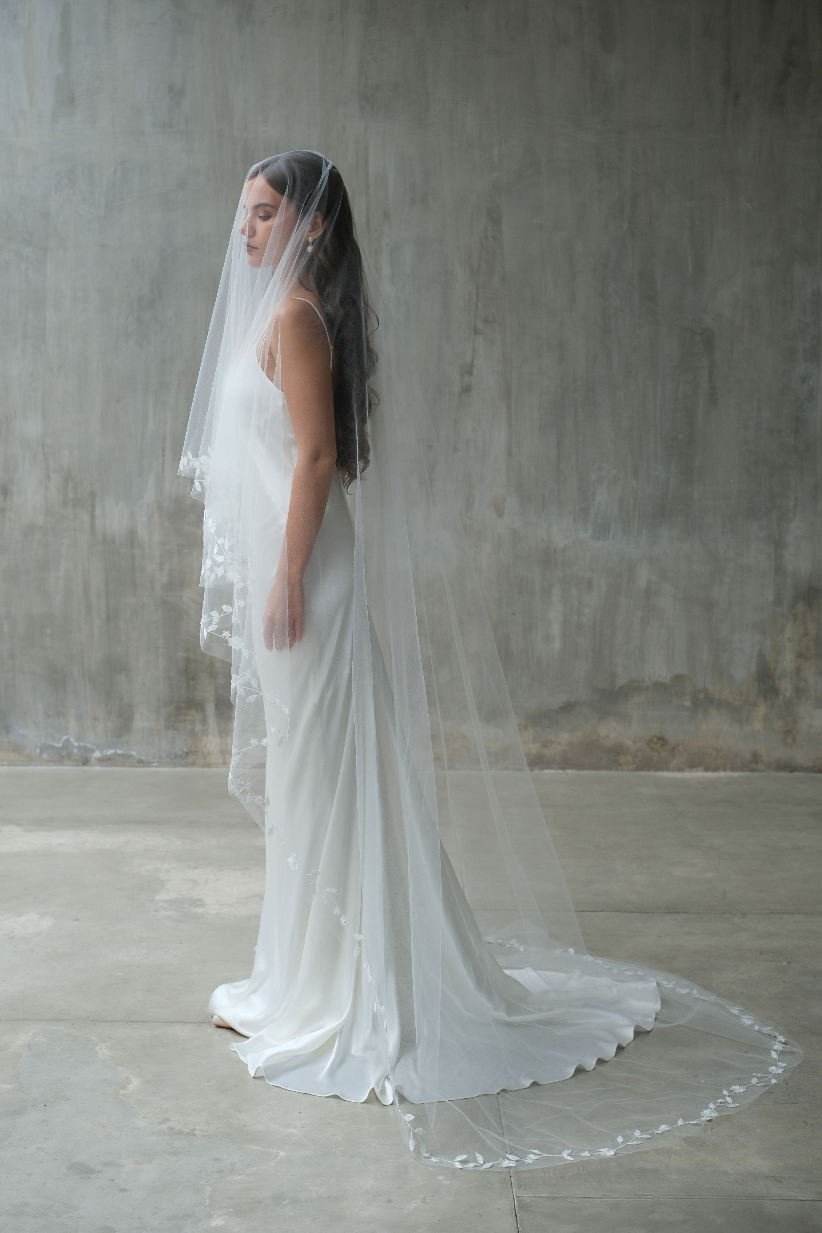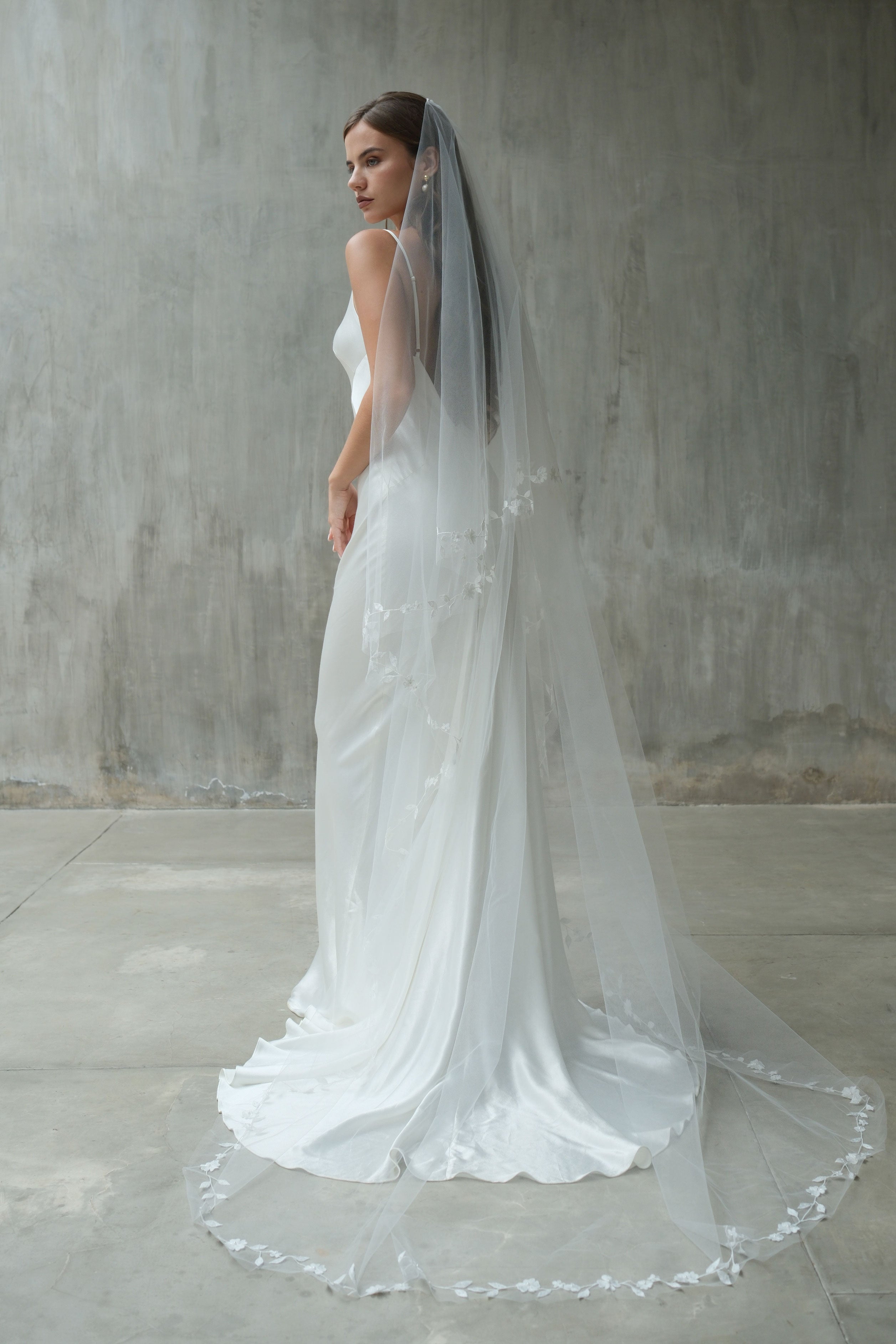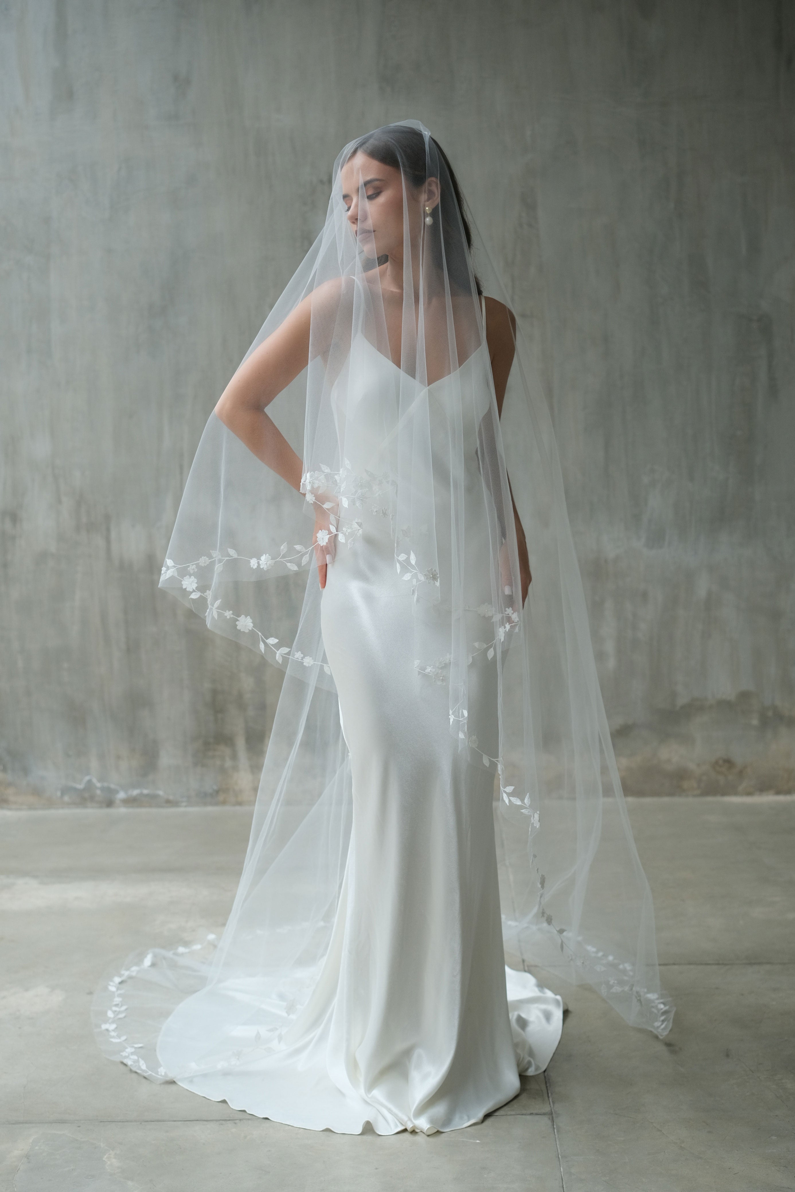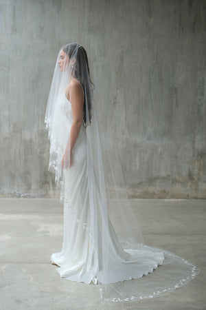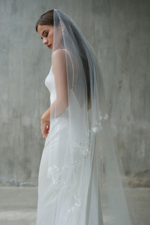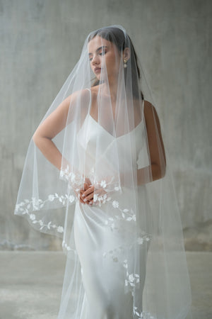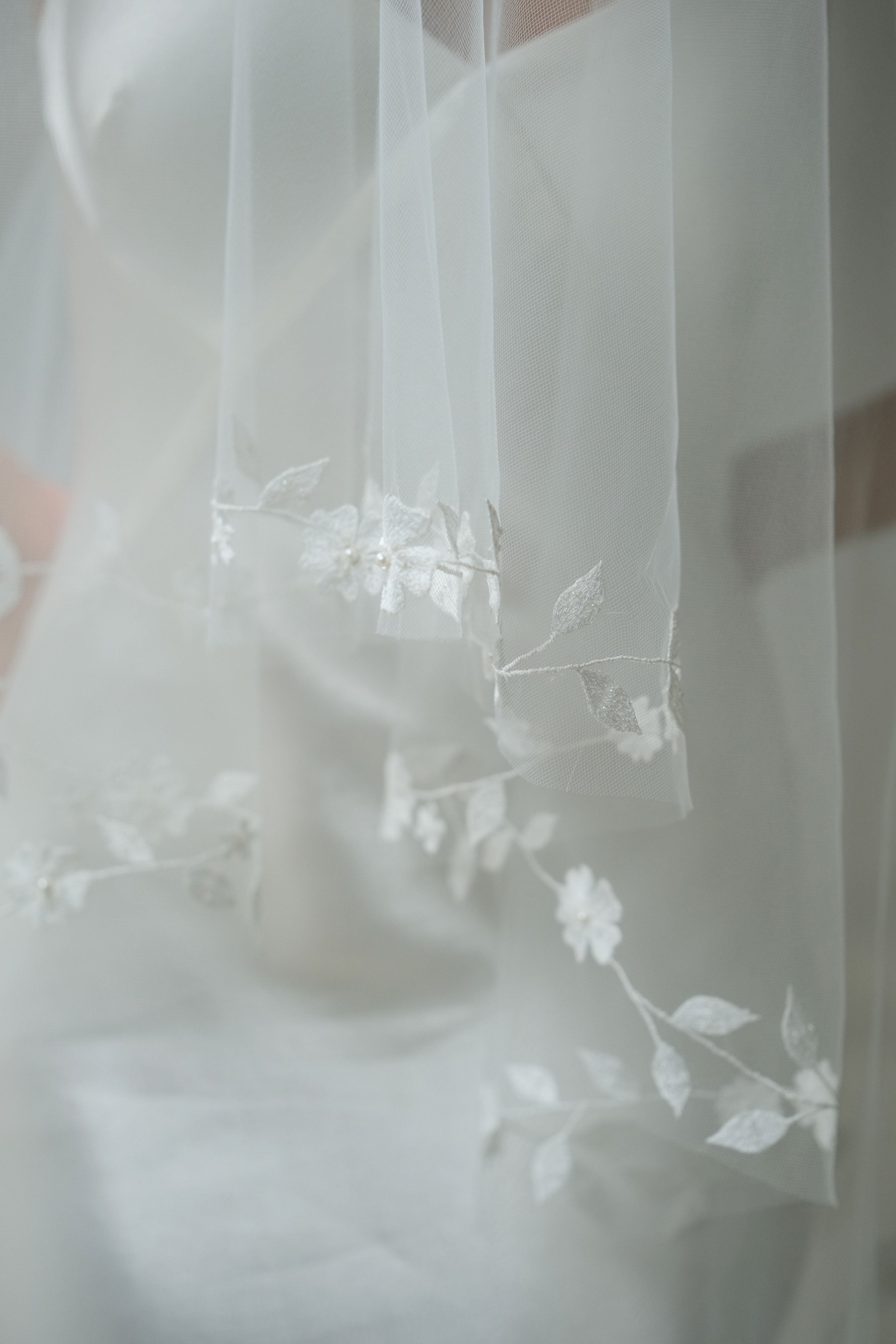 This handcrafted two-tier drop veil showcases exquisite botanical embroidery along the edges, featuring delicate leaf and floral motifs with minimal bead embellishment. Designed to fall flat on the head with no gathering, it reflects exceptional craftsmanship and timeless elegance, with a blusher layer that adds a refined, romantic touch.