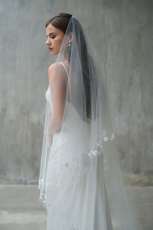 Drop veil (no gathers at the comb). The top tier, also known as the blusher, can be worn over the face for the ceremony, creating a beautiful bridal moment. This veil features floral embroidery adorned with tiny pearls and is attached to a 3.5” (8.5 cm) wide metal wire comb for secure placement.
