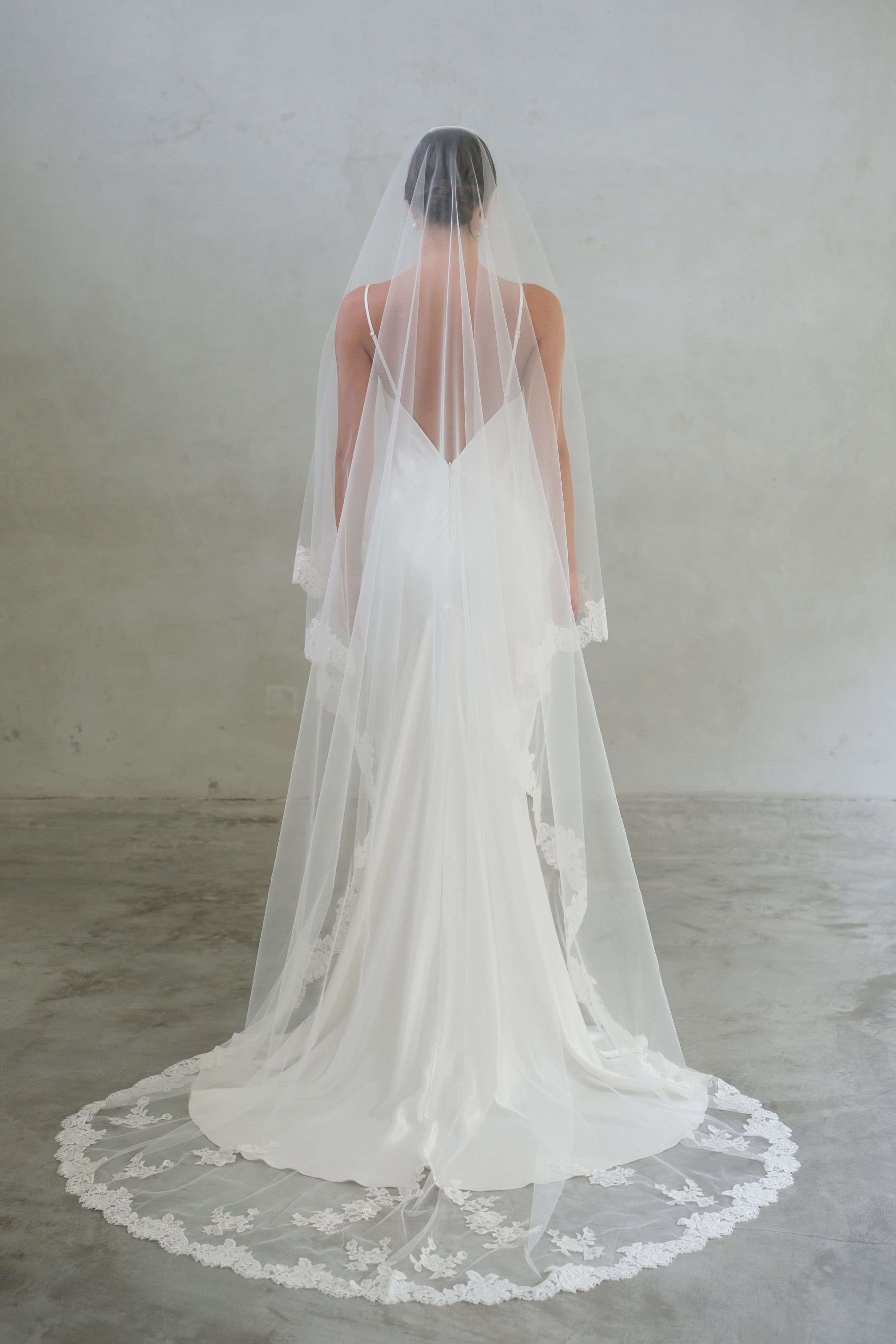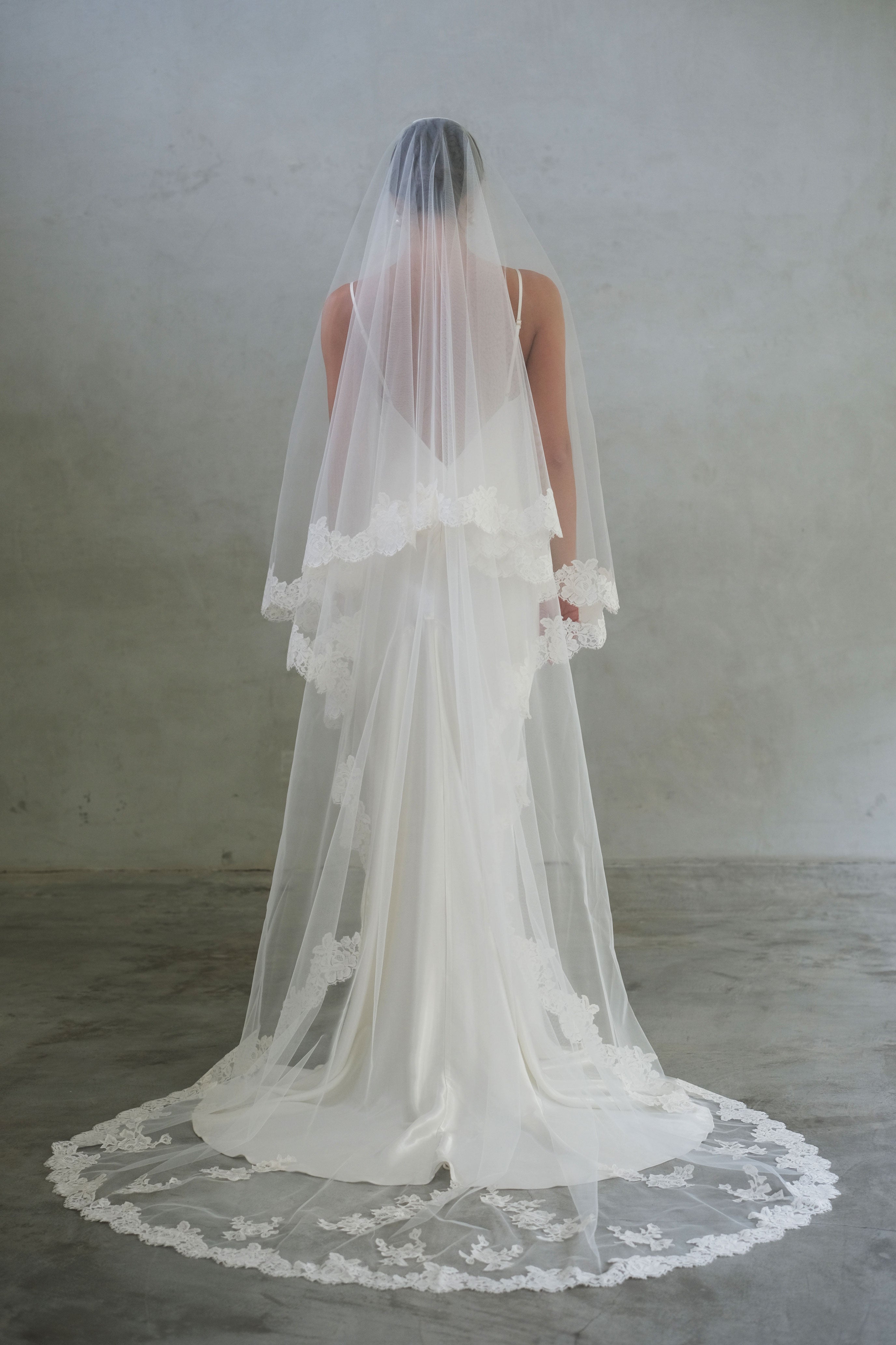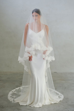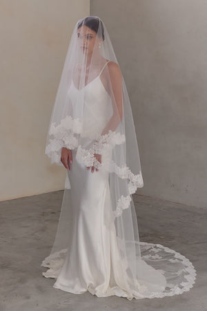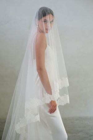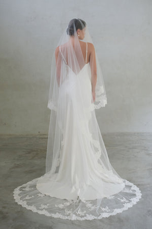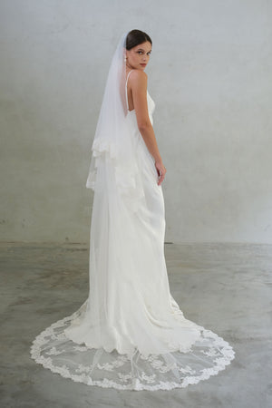This two-tier lace-edged drop veil is handcrafted from airy tulle with soft lace trim. Designed to fall flat with no gathering, it features a blusher layer for the ceremony and scattered lace appliqués along the veil for an effortlessly romantic, refined finish.