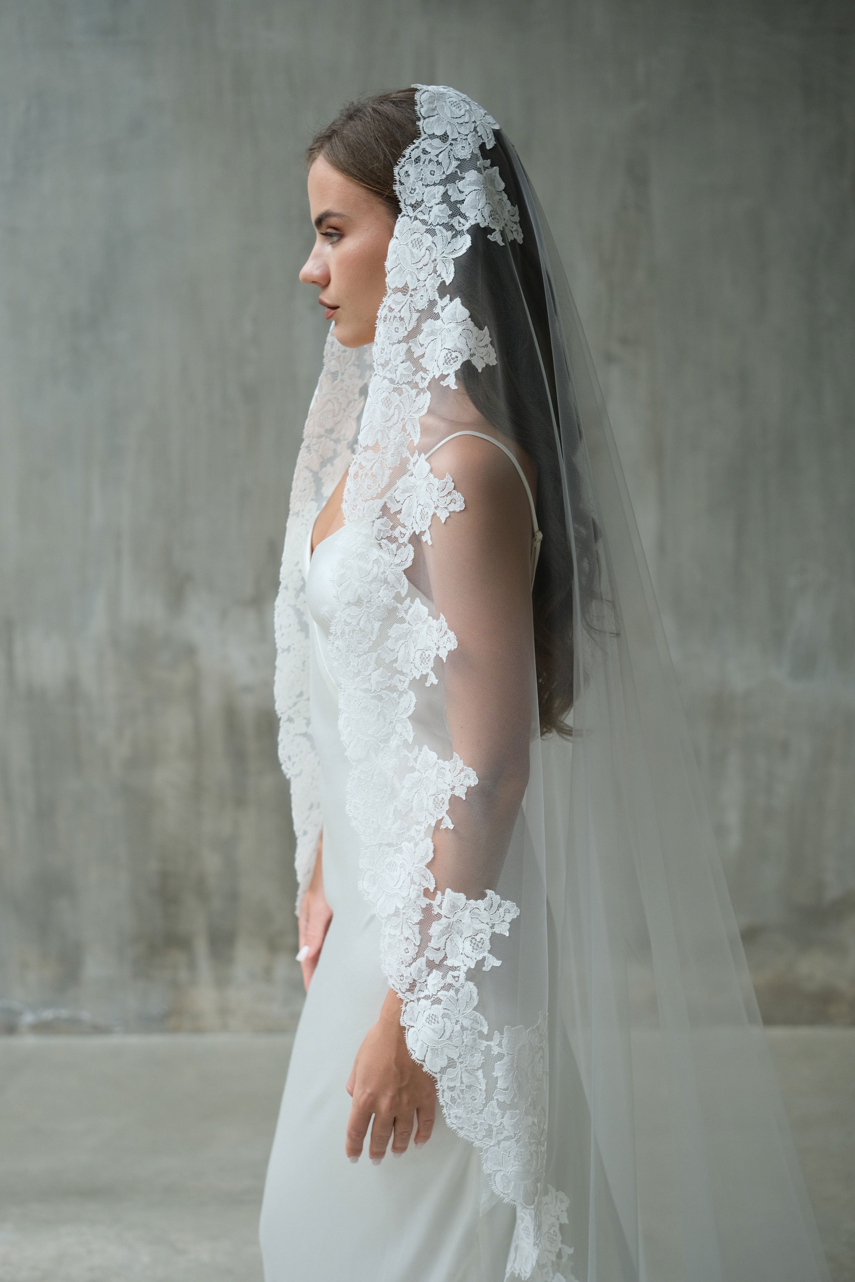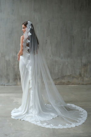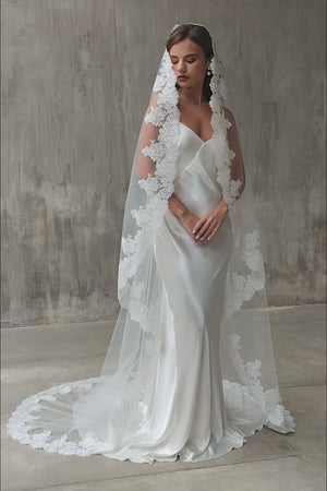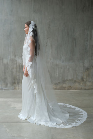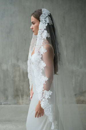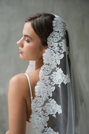 MIA Mantilla veil is a timeless statement of romance and elegance. Designed with sheer, airy tulle and finished with a delicate lace edge, it softly frames the face and cascades beautifully down the back. Perfectly suited to both modern and traditional bridal gowns, this lace-edged veil adds a refined, European-inspired touch to your wedding day look.
