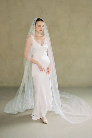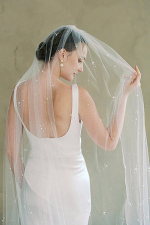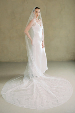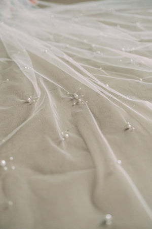 Introducing Perla, a one-tier bridal veil that effortlessly combines contemporary minimalism with the eternal charm of pearls. Every graceful pearl is strategically positioned to produce a subtle yet enchanting glimmer, elevating the sleek silhouette of this simple yet striking design. Perla is the perfect selection for the discerning bride in pursuit of a refined and understated expression.