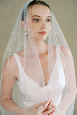 One-tier veil (has gathered tulle on comb) with scattered pearl.