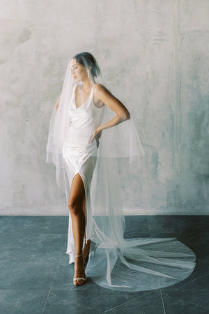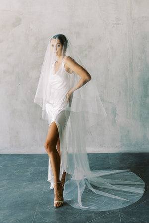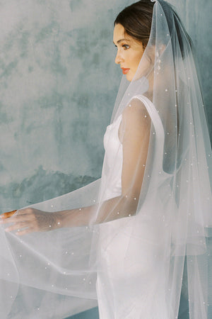 AVA II is a two-tier style adorned with pearls, perfect for the modern brides. The various sized hand-embellished pearls beautifully create a radiance that compliments the bride, without overpowering.
