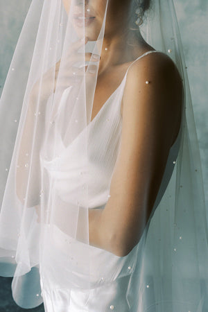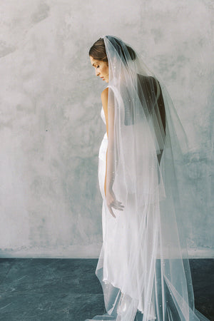 Madame Tulle pearl veils uniquely stand out from others, not only are they entirely hand embellished, but they are also completely free of metal pins. Both sides of the veil are beautifully spread with choice pearls so that the pearls will still gracefully be on display from all angles.