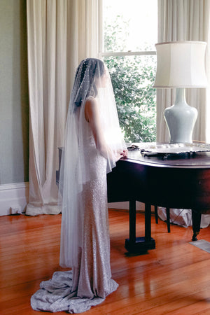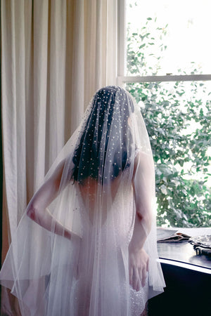 Madame Tulle pearl veils uniquely stand out from others, not only are they entirely hand embellished, but they are also completely free of metal pins. Both sides of the veil are beautifully spread with choice pearls, making it the perfect option for two-tier veils with a blusher. When the blusher is lifted over the head, the pearls will still gracefully be on display from both sides. Our method of double-sided pearls also prevents the underside of the veil from potentially catching on the dress as you walk.