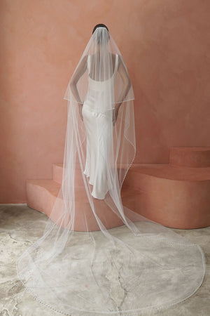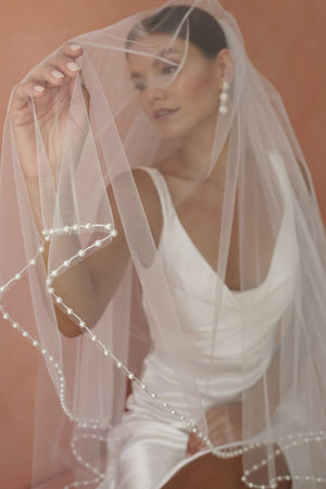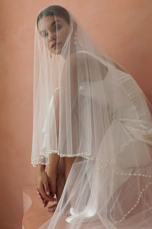 Gorgeous two-tier veil with medium size pearls delicately tied on the edges. Perfect for your modern contemporary bridal look, ODETTE II brings the perfect touch of timeless elegance to your bridal ensemble.