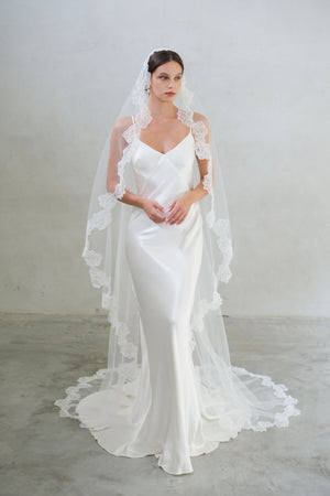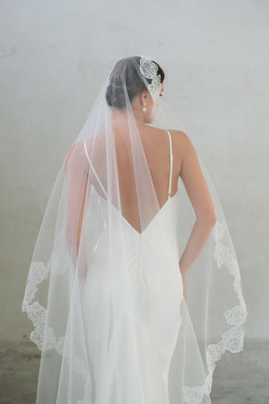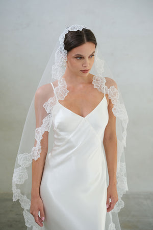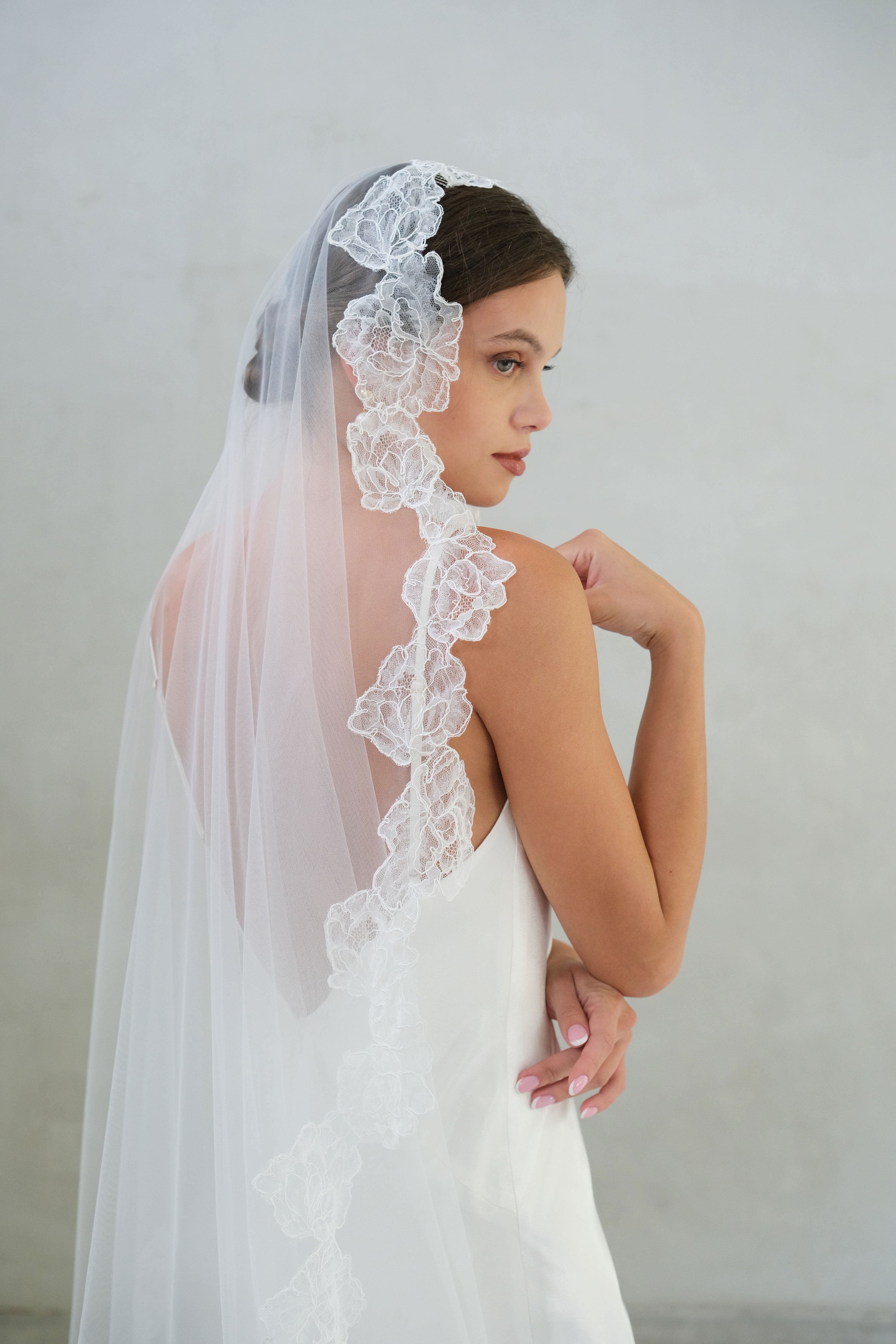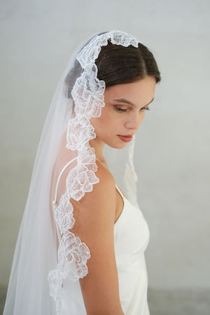 This modern one-tier Mantilla veil features a beautifully unique floral lace edge, designed with a fresh, contemporary feel rather than a traditional trim. Made from sheer, lightweight tulle, it drapes effortlessly to frame the gown with soft romance and refined detail.
