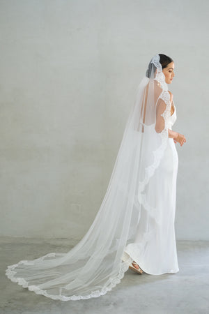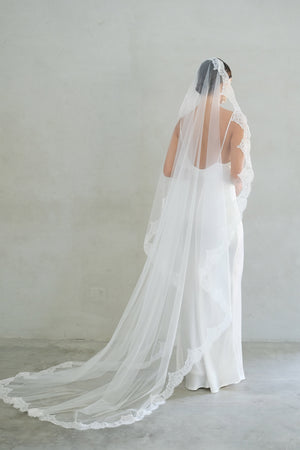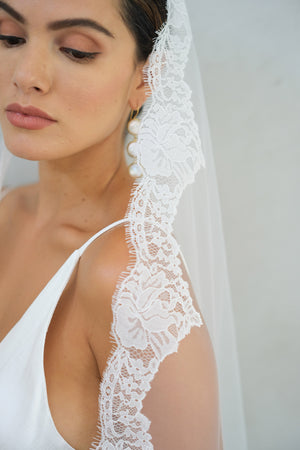 BELLEROSE I | Mantilla Veil is the perfect addition for modern brides. Crafted with delicate lace, this veil will add a timeless and elegant touch to any wedding look.