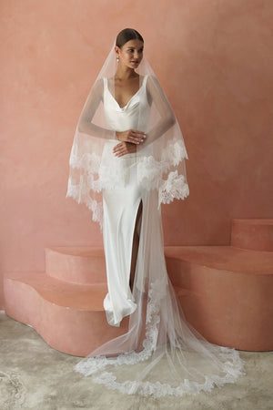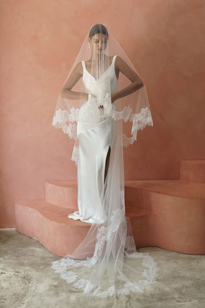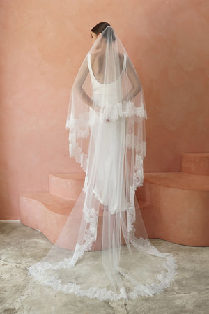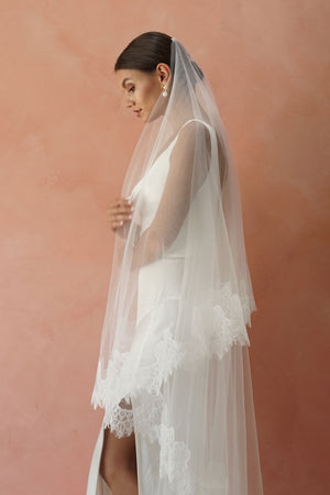 Complete your classic yet modern bridal look with the CHANTELLE II drop veil. This two-tier veil features a delicate Chantilly lace trim which adds a beautifully romantic touch. Perfect for any bride searching for a soft, elegant look with timeless finish.