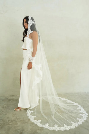 This one-tier Mantilla veil is finished with a beautifully romantic corded lace trim, offering a timeless and traditional bridal feel. A perfect accompaniment for both traditional wedding dresses and modern bridal silhouettes seeking a touch of lace romance.