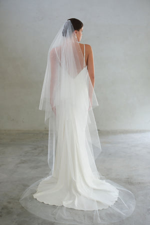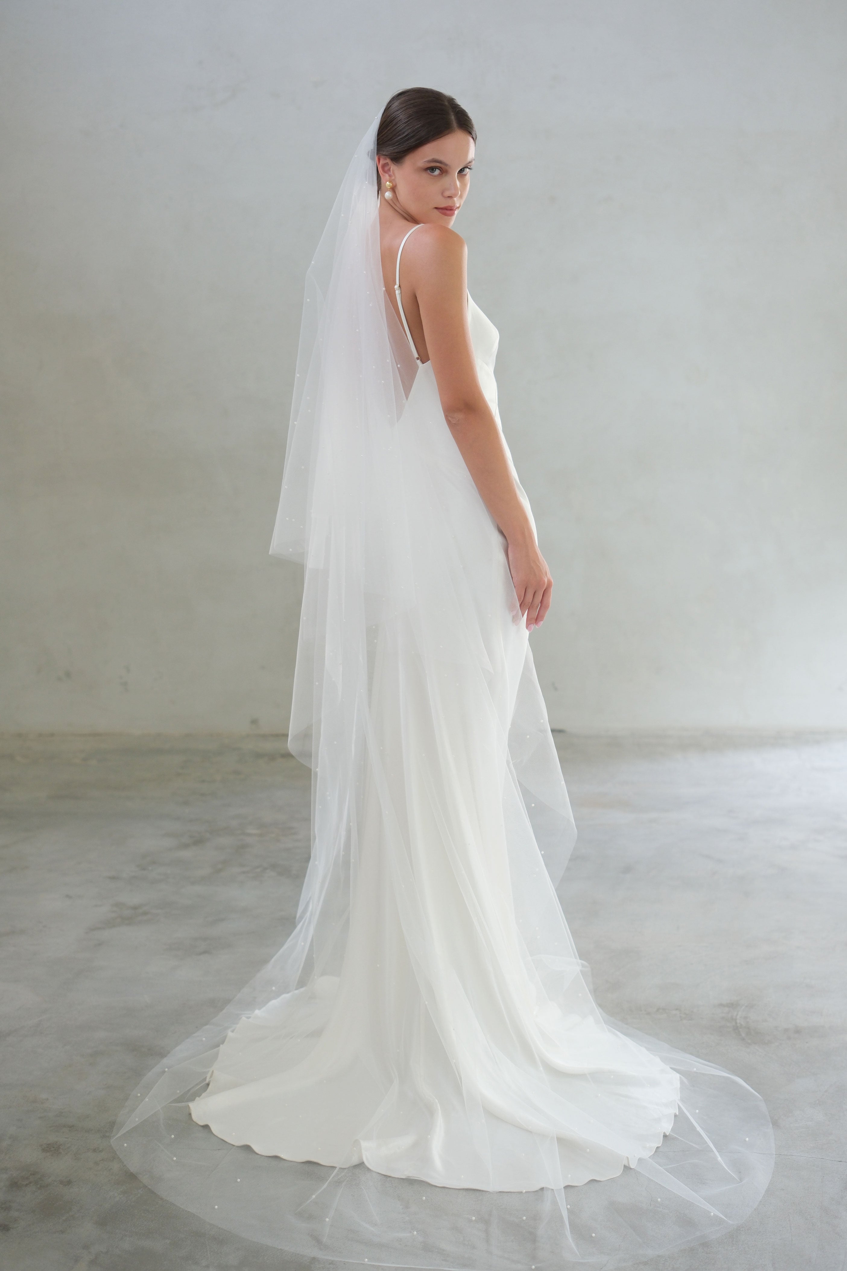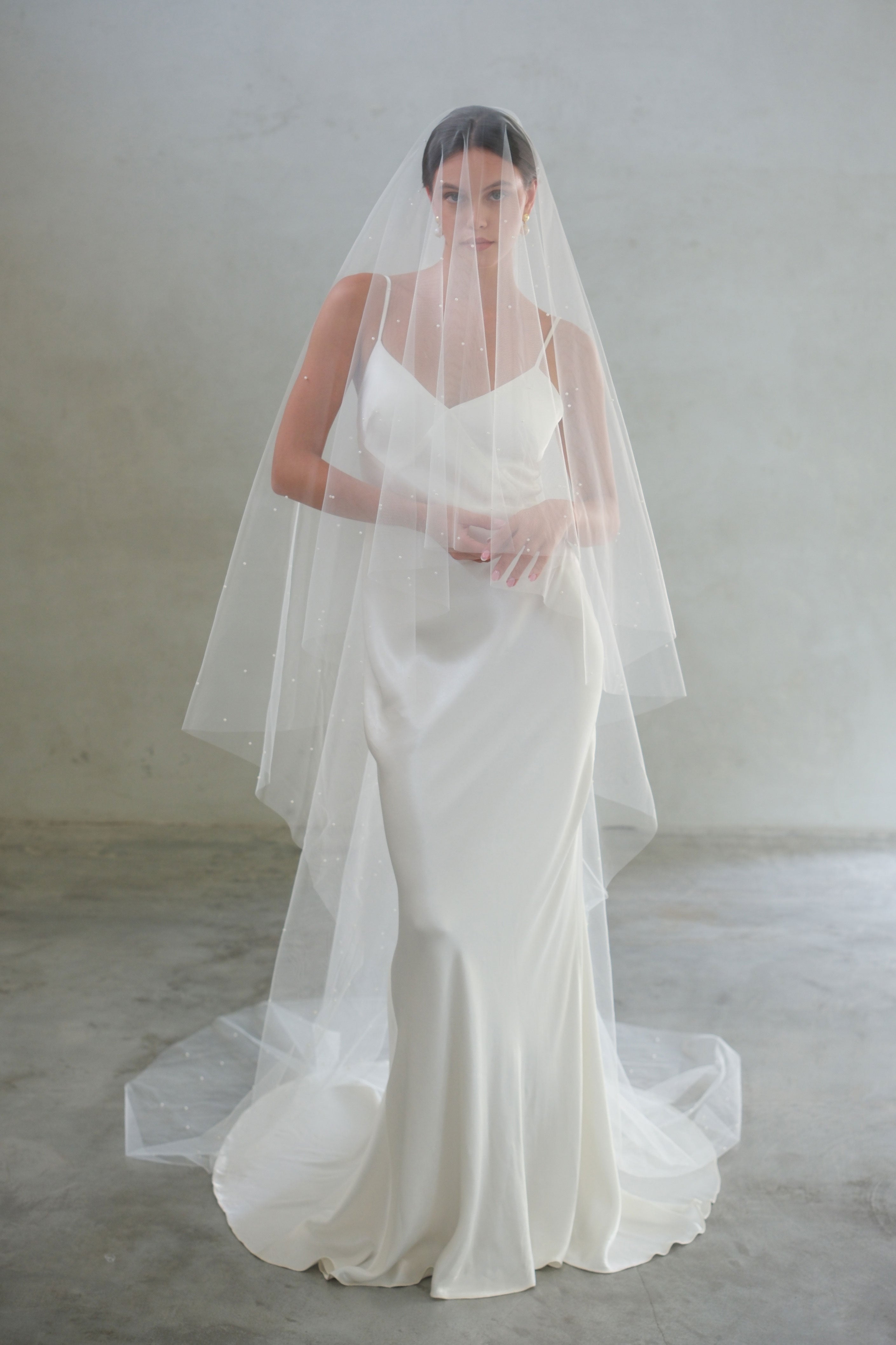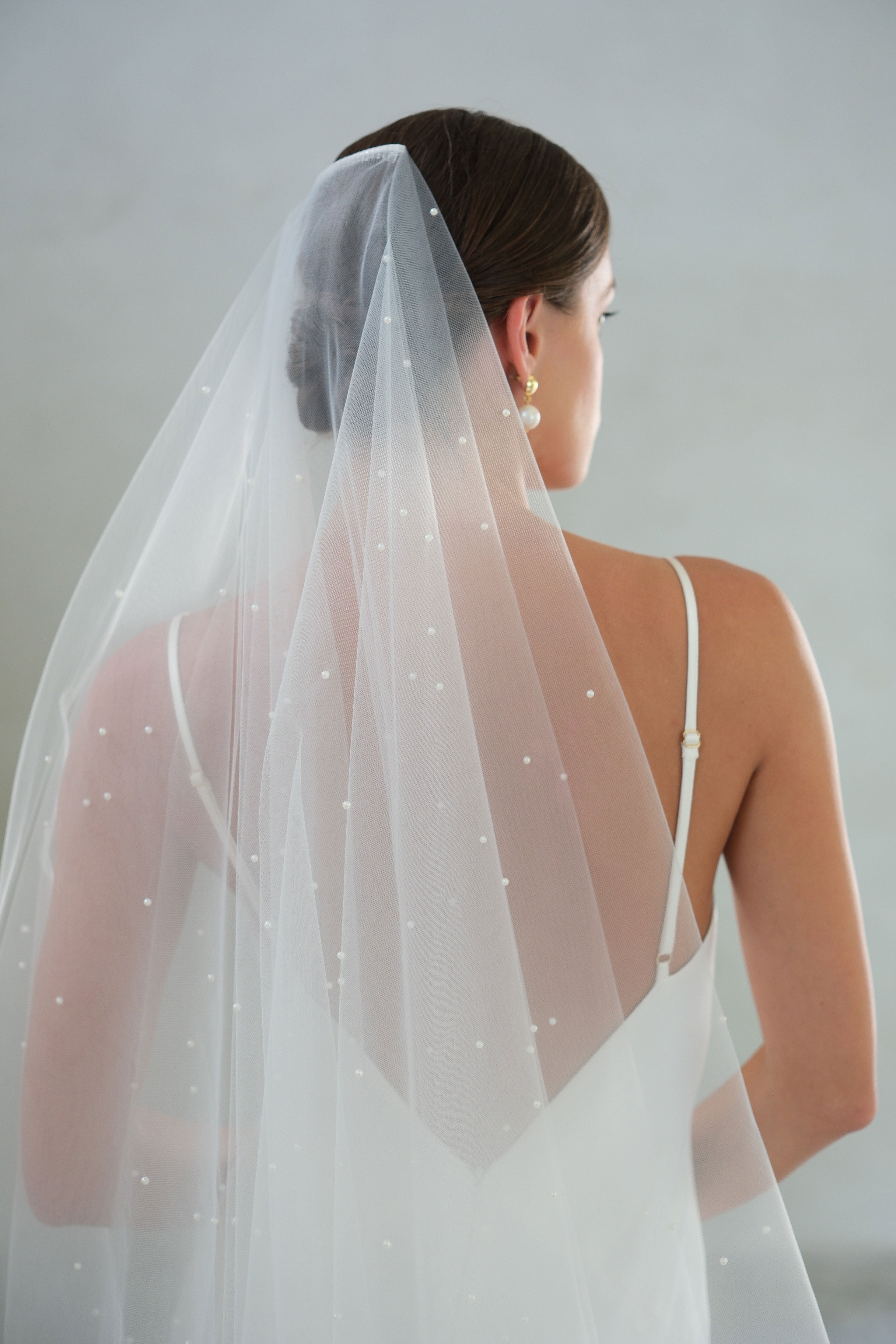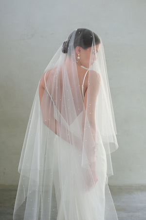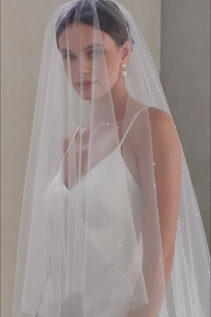 Madame Tulle pearl veils uniquely stand out from others, not only are they entirely hand embellished, but they are also completely free of metal pins. Both sides of the veil are beautifully spread with choice pearls so that the pearls will still gracefully be on display from all angles.