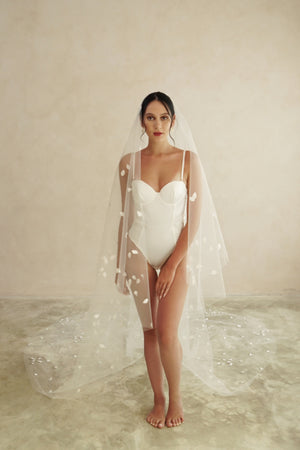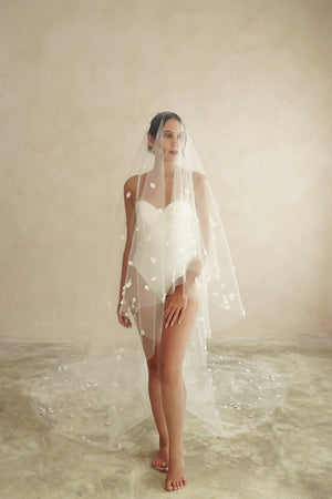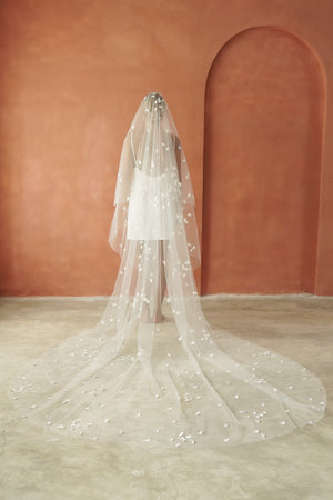 JASMINE II is a two-tier cathedral length drop veil. It is generously sprinkled with soft satin, laser-cut leaves, centred with delicate glass beads. The satin leaves are arranged to create unique and irregular shapes, mimicking the beautiful irregularity of patterns and shapes found in nature. For a bride who desires a unique and spontaneous veil arrangement, the Jasmine is graceful, while remaining free-spirited.