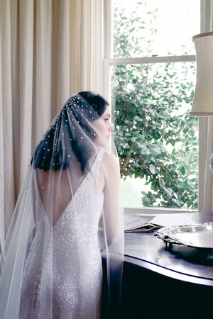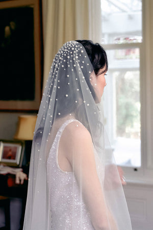 Madame Tulle pearl veils uniquely stand out from others, not only are they entirely hand embellished, but they are also completely free of metal pins. Both sides of the veil are beautifully spread with choice pearls so that the pearls will still gracefully be on display from all angles. Our method of double-sided pearls also prevents the underside of the veil from potentially catching on the dress as you walk.