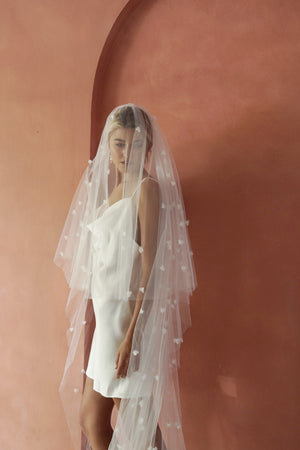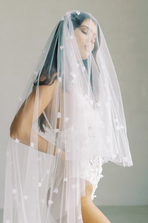 SARA II is a romantic, two-tier veil available in both chapel and cathedral length. It has been gently embellished by hand, with soft fabric flowers and small pearls. The fabric cut flowers are softly spread over the veil, adding dimension and unique touch, while not becoming overpowering.